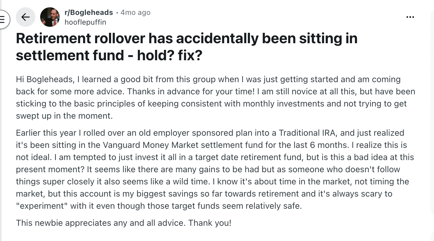 A Reddit poster accidentally left funds uninvested in a rollover account